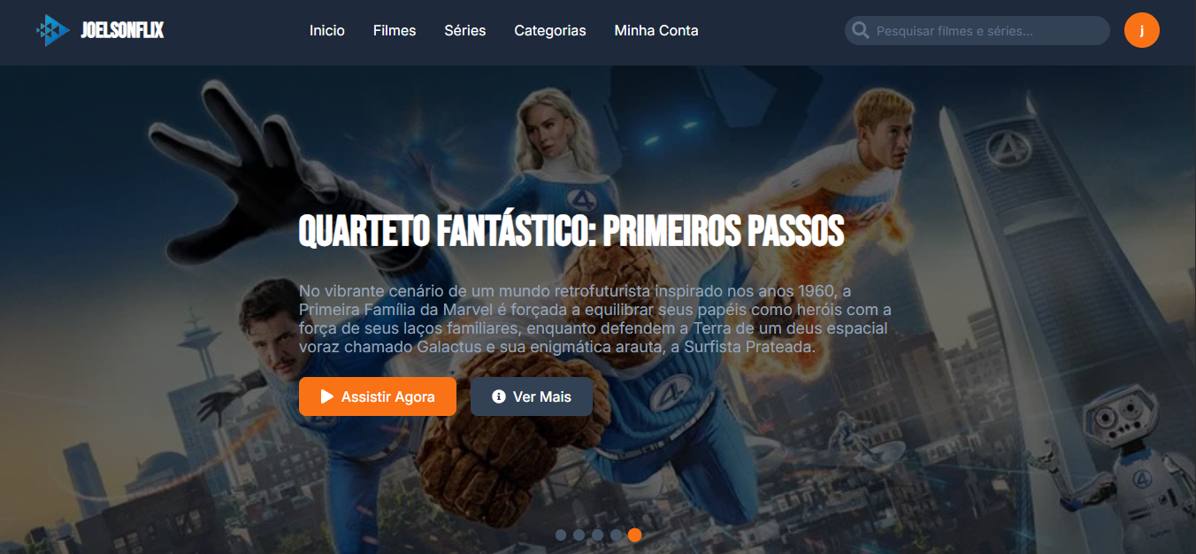 JoelsonFlix é uma plataforma de streaming feita em React, que consome a API do TMDb para exibir filmes e séries atualizados. Utilizei CSS Modules para garantir estilos organizados e sem conflitos. A interface é responsiva, limpa e intuitiva. O usuário pode explorar categorias, detalhes e trailers com fluidez.